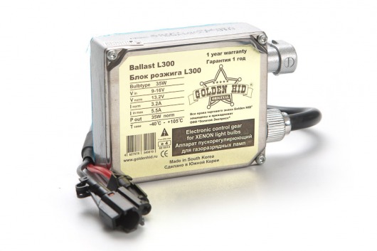 Блок розжига Golden HID L300 — балласт в толстом корпусе для розжига электрической дуги ксеноновой лампы. Герметичный, способен работать в различных диапазонах напряжения. Разжигатель Голден Хид L300 генерирует высоковольтные импульсы до 25 000 Вольт. Данную модель можно использовать с любыми китайскими и корейскими лампами.
