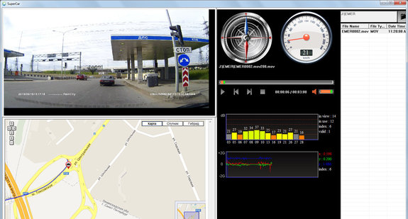 Вместе с видеорегистратором поставляется программа SuperCar, при помощи которой можно одновременно смотреть отснятый материал и видеть положение автомобиля на карте. Для работы программы компьютер должен быть подключен к Интернету.
