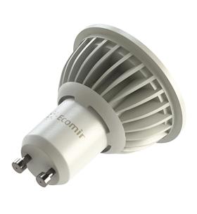 Светодиодная лампа Ecomir GU10 4W эквивалентна галогеновой лампе мощностью 35 Вт с цоколем MR16. Потребляемая мощность – всего 4 Вт, цветовая температура – 3000 К (это желтый свет). Световой поток — 300 лм. Напряжение — 220 В. Матовый рассеиватель. Угол освещения > 90°.