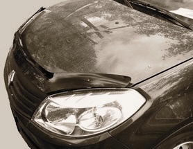 Дефлектор капота для Renault Sandero — это щиток из орг.стекла темного цвета, который крепится на переднюю часть капота. Благодаря тому, что дефлектор разработан специально для Renault Sandero от 2009 г.в., устанавливается он легко и быстро, при этом сверлить кузов вам не нужно. По форме же накладка полностью повторяет контуры капота. Данная модель прочна и долговечна: она надежно крепится, не боится коррозии, экстремальных температур и серьезных перегрузок.