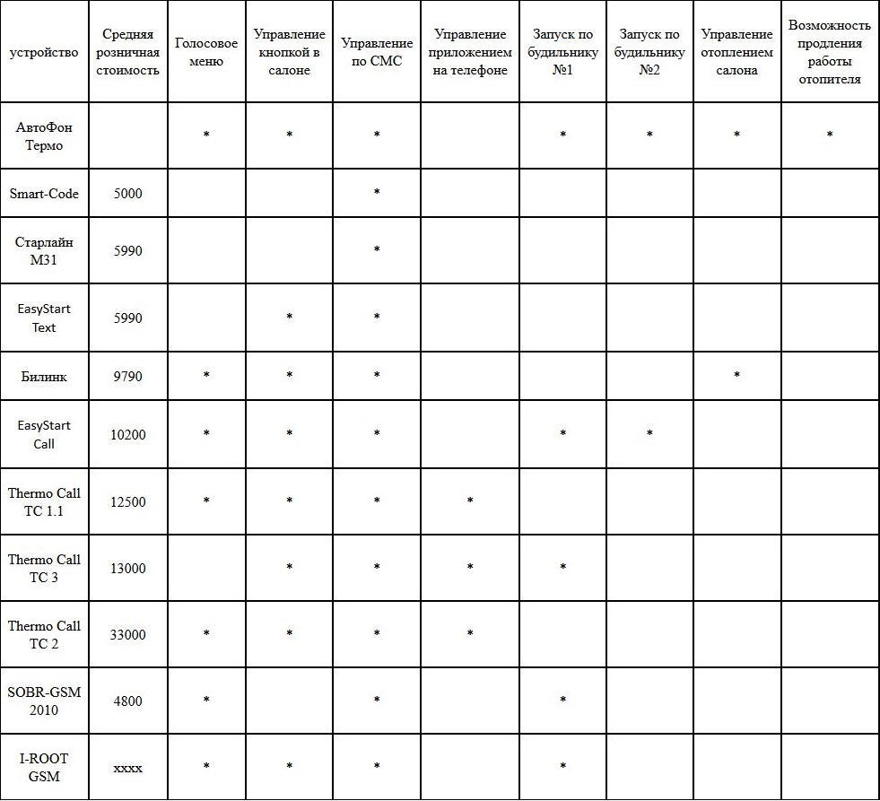 В частности, лишь АвтоФон-Термо имеет функцию продления работы отопителя. Вы можете ознакомиться с приведённой таблицей, где сравниваются самые популярные модели.