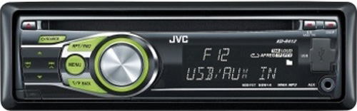 CD-ресивер JVC KD-R412EY мощностью 50Вт на каждый из четырех каналов поддерживает воспроизведение MP3 и WMA, а через фронтальный порт USB можно подключить любой USB-носитель. Модель также имеет выход предусилителя (RCA) и передний AUX-вход.