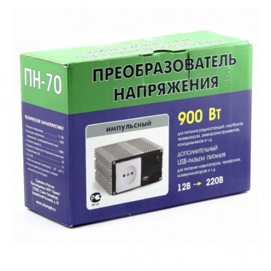 Импульсный преобразователь напряжения Орион ПН-70 900 подключается к «прикуривателю» в салоне автомобиля с напряжением 12В и на выходе выдает эффективное напряжение в 220В. Максимальная мощность - 900 Вт. Инвертор имеет защиту не только от пониженного и повышенного входного напряжения, но и от перегрева, перегрузки, короткого замыкания. Кроме этого, в данном автоинверторе имеется независимый выход питания USB  для работы и зарядки портативных устройств.