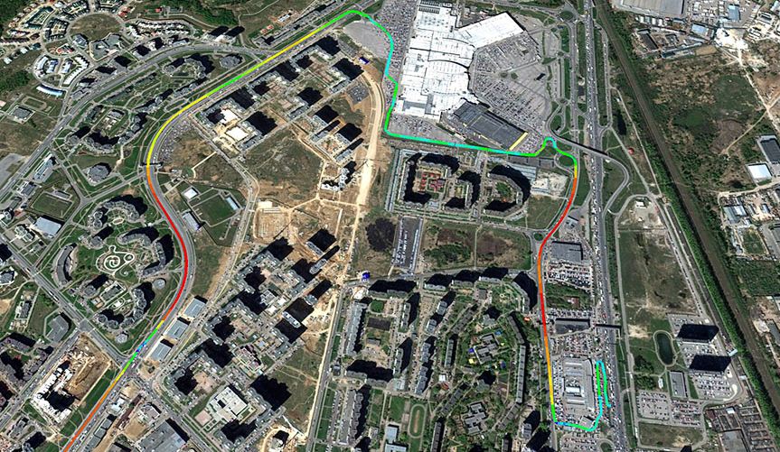 GPS-трекер. GPS-приемник позволяет определять ваше местоположение во время движения (на 2-х картинках снизу: чем быстрее скорость, тем краснее маршрут). Запись данных с приемника и видеозапись ведутся одновременно, что делает ваш видеорегистратор бортовым самописцем.