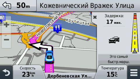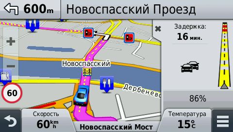 Автомобильный навигатор Garmin 2597LMT использует сервис Яндекс.Пробки как основной источник информации о трафике. Уровень загруженности отображается на экране в баллах.