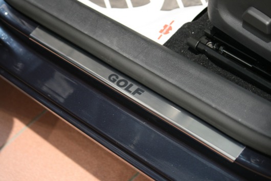 Внутренняя накладка на порог Volkswagen Golf VI — это аксессуар автомобильного тюнинга, который защищает внутренний порог от механических повреждений при посадке и высадке из машины. Декоративные накладки с рисунком на внутренние пороги предназначены для автомобилей Volkswagen Golf VI от 2009 г.в. с 5-ю дверями.