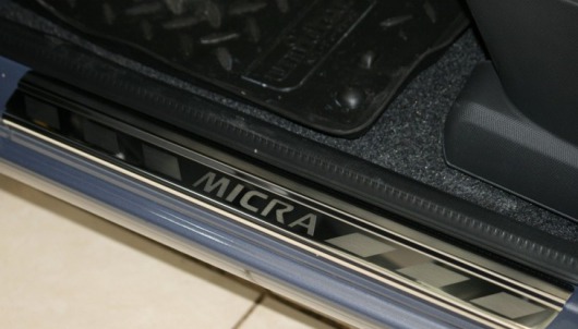 Внутренняя накладка на порог Nissan Micra  — это аксессуар автомобильного тюнинга, который защищает внутренний порог от механических повреждений при посадке и высадке из машины. Декоративные накладки с рисунком на внутренние пороги предназначены для автомобилей Nissan Micra от 2004 г.в.