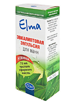 Эвкалиптовая эмульсия — косметическое средство для ванн, заметно улучшает состояние кожи, подверженной целлюлиту, восстанавливает её упругость и тонус. Уменьшает эффект «апельсиновой корки» и не эстетичных жировых отложений, кожа становиться более гладкой и эластичной, наполняется жизненной силой. Эвкалипт является мощным природным антисептиком.