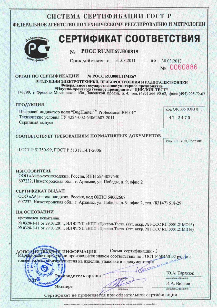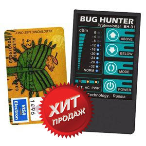 Обнаружитель шпионского оборудования профессионального класса BugHunter Professional BH-01 эффективно обнаруживает как аналоговые, так и цифровые жучки (любые радиомикрофоны, беспроводные камеры, мобильные телефоны и другие устройства). Детектор жучков работает в широком диапазоне частот — от 50 до 3000 МГц и имеет стабильно высокую чувствительность. Может работать в скрытом режиме при использовании наушников.