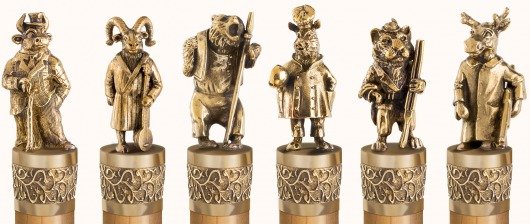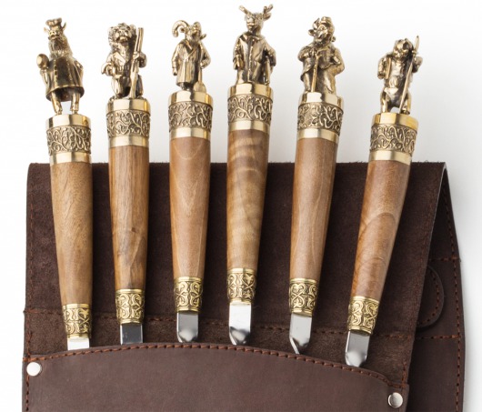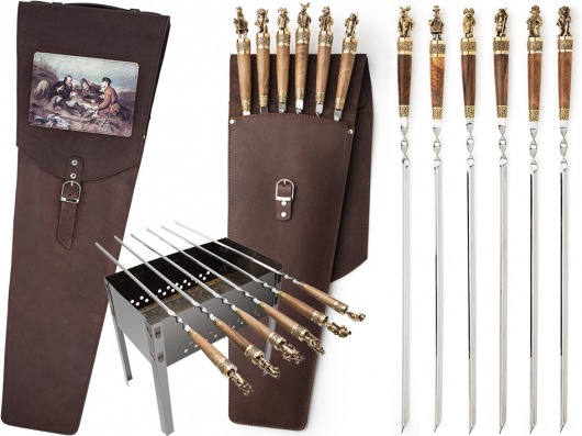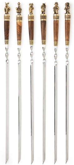 • Особого внимания заслуживает ореховая рукоятка с литым бронзовым фигурным наконечником. Каждая фигурка — это автроская ювелирная работа. Ручка крупная, массивная, хорошо лежит в руке и при этом не перевешивает шампур.