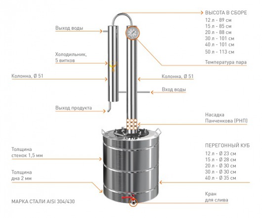 Его основное отличие от самогонного аппарата Добрый Жар Профи заключается в большем диаметре колонны, что позволяет увеличить производительность аппарата и степень очистки.