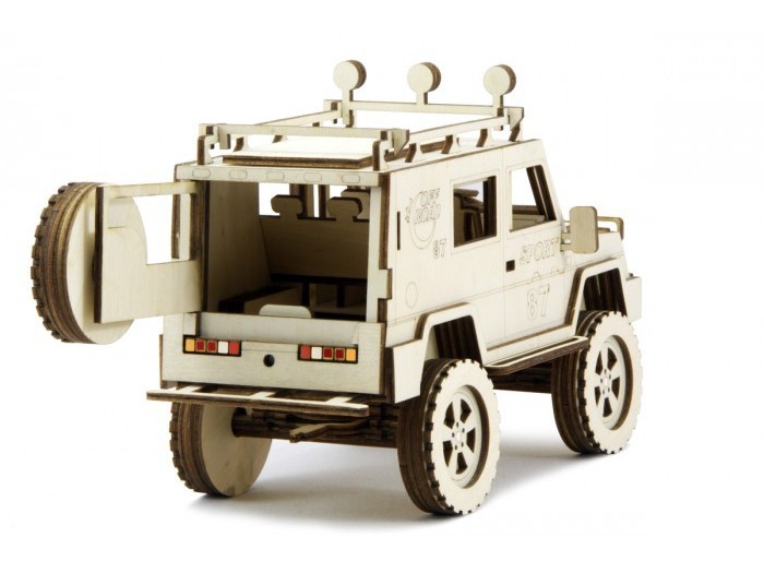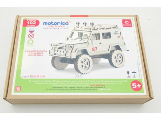 Детали конструктора Lemmo легко и в то же время интересно собираются в красивую и реалистичную игрушку-внедорожник. При этом в набор входит клей ПВХ и наждачная бумага, с помощью которых ваш ребенок может собрать развивающий конструктор наиболее аккуратно. После сборки деревянного внедорожника можно раскрасить его гуашевыми и акриловыми красками. В результате у вас дома появляется полноценная и красочная деревянная машинка, у которой к тому же есть подвижные элементы (вращаются колеса и открывается задняя дверка). А это не может не обрадовать ценителей качественных и экологически чистых игрушек.